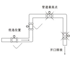(4)流量計(jì)安裝位置介質(zhì)不滿時(shí),可采取抬高流量計(jì)后端管路的方法,使其滿管,嚴(yán)禁在管道最高點(diǎn)和出水口安裝流量計(jì)。